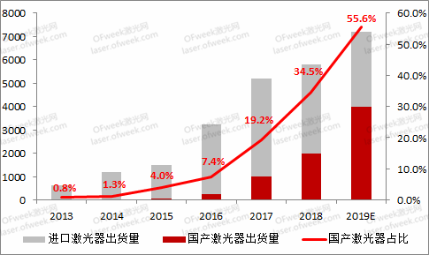 國產高功率光纖激光器產品近年來在“量”上取得令世界矚目的進步。據《2019中國激光產業發展報告》披露,2018年我國光纖激光器1500瓦以上國產出貨量約占總出貨量的34.5%,預計2019年國產高功率激光器出貨量將超過進口激光器。